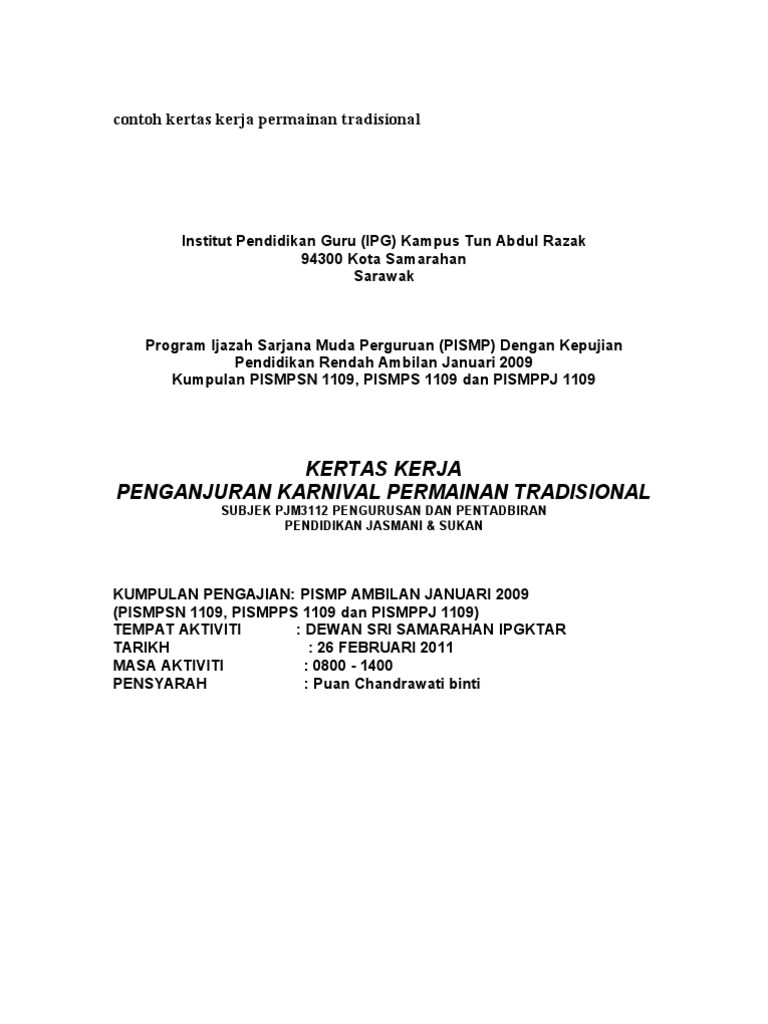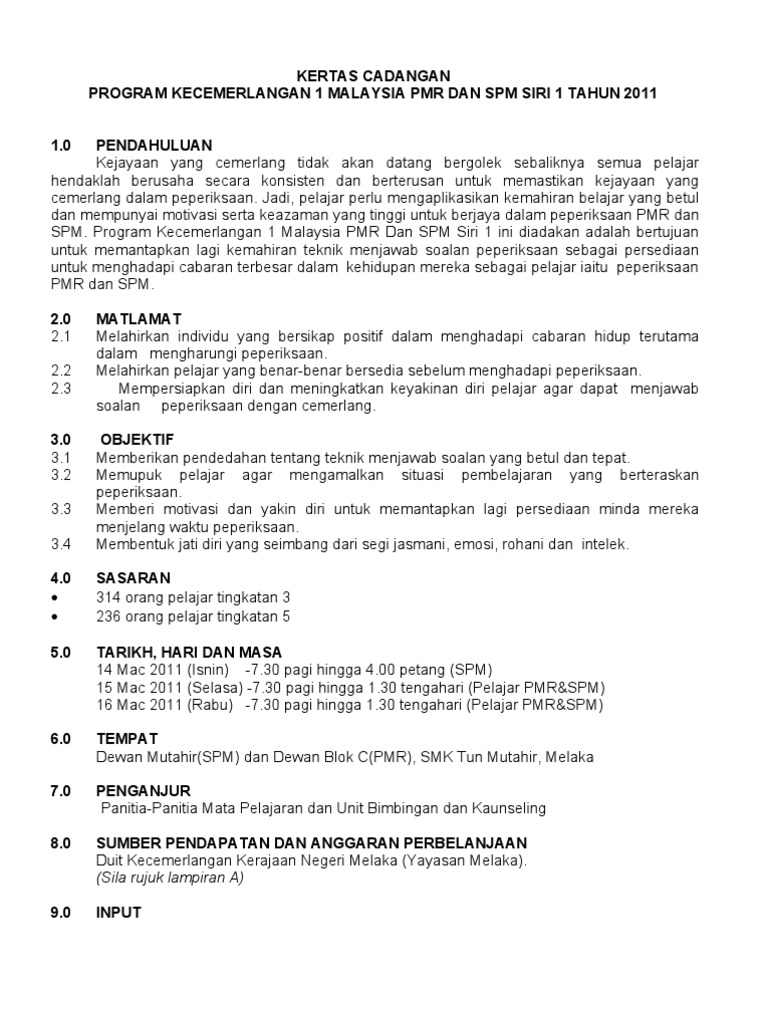 Kertas cadangan program kecemerlangan pmr/spm. Cadangan ini adalah satu cadangan kajian penyelidikan untuk mencari hubungkait antara. Kertas kerja untuk melatih pekerja. Kertas cadangan minggu anti dadah. Kertas kerja kejohanan sukan tahunan.